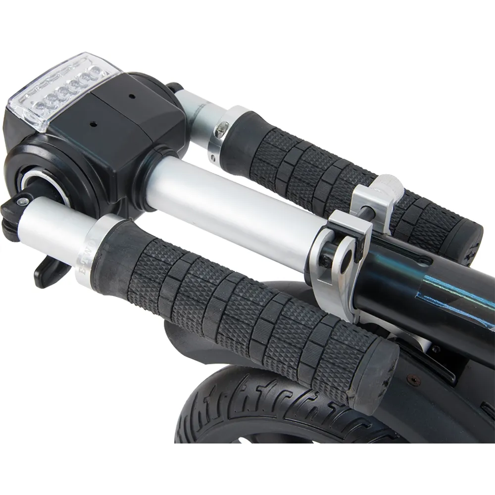 Самокат складывается, руль отпускается к стойке и вместе прижимаются к платформе. В таком состоянии его габариты очень малы.