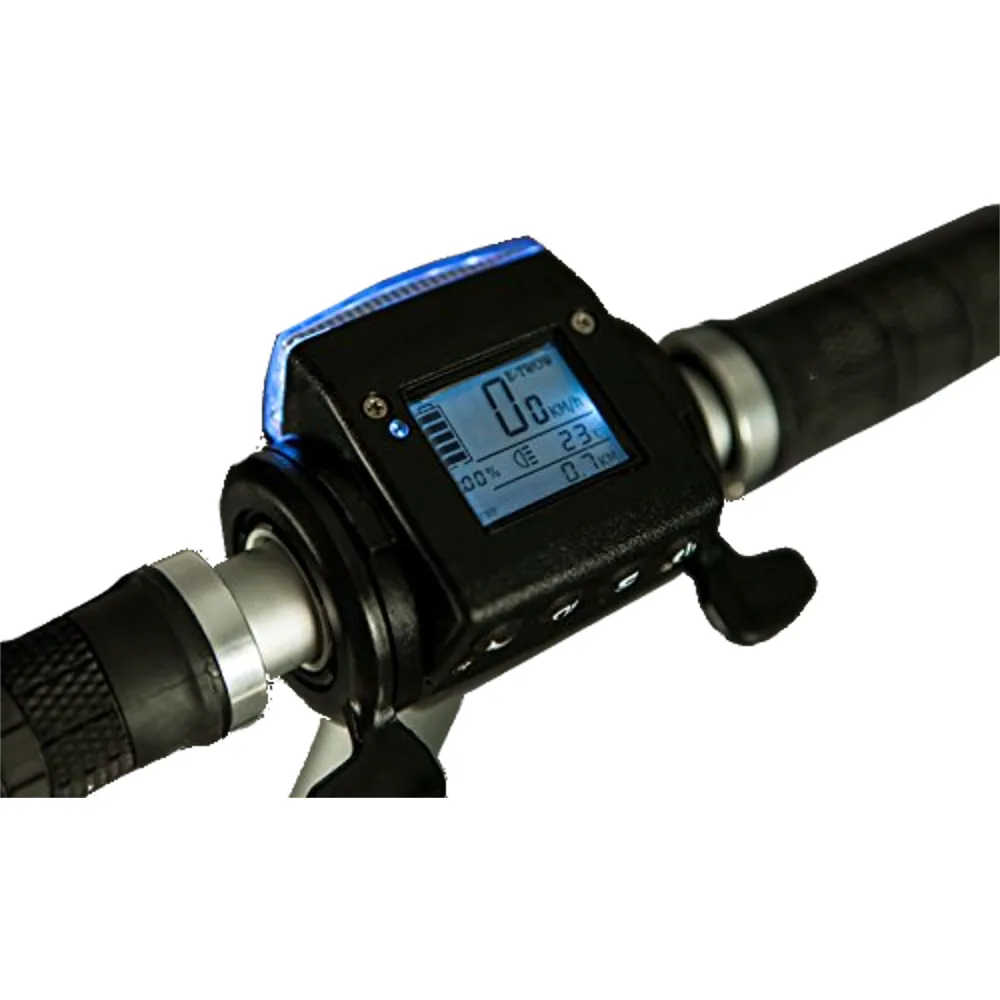 Электросамокат Generic E-twow S2 BOOSTER на рулевой стойке имеет светодиодную фару, информационный дисплей, на котором отражается скорость, заряд батареи, длительность хода.
