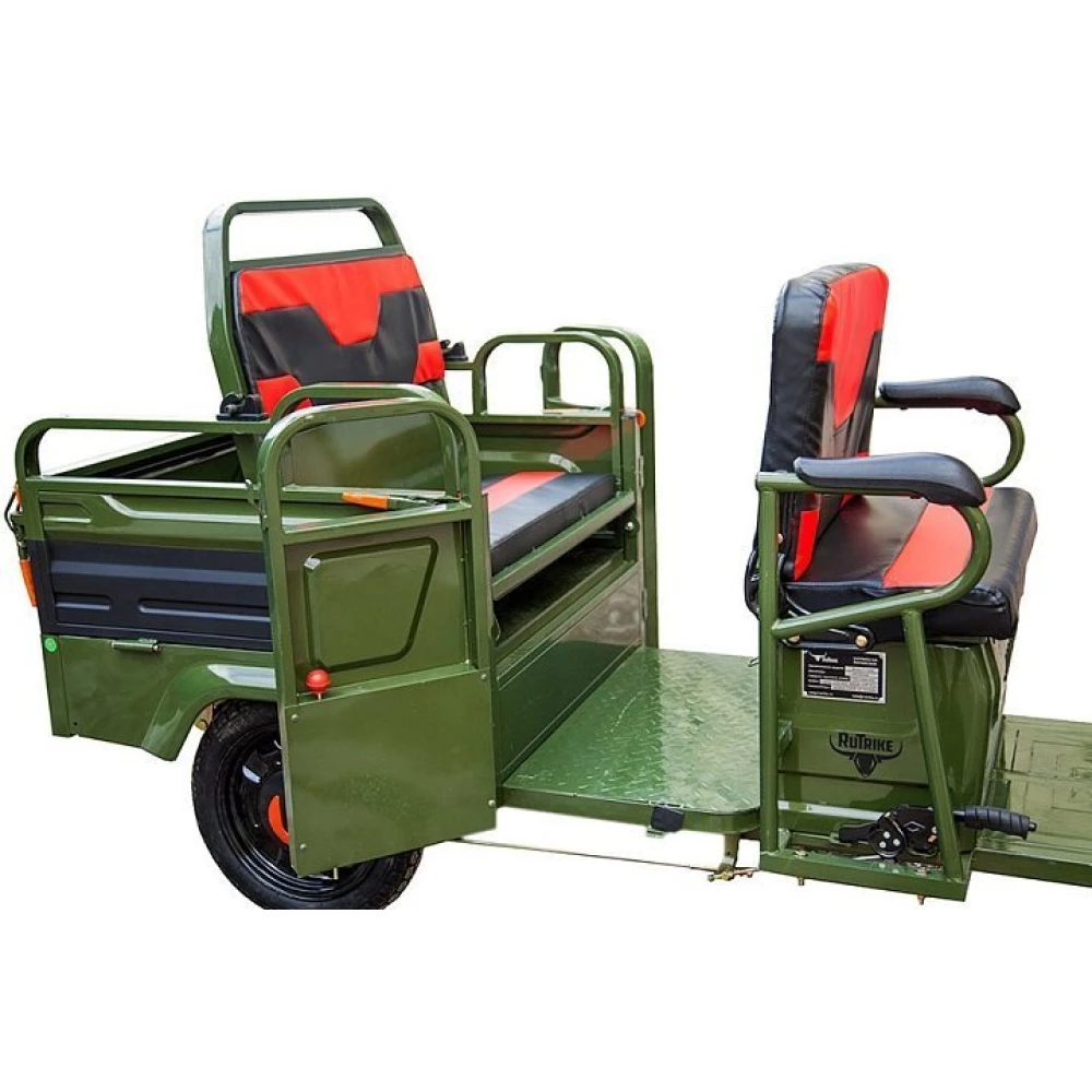 Груовой электротрицикл Rutrike Вояж-П 1200 Трансформер 60В 80 Вт в зеленом цветовом оттенке - техника, предназначенная для лиц с активной жизненной позицией, жителей сельских районов, для которых отдых на свежем воздухе находится на первом месте. Электротрицикл грузоподъемностью до 400кг идеально подходит для вылазок с друзьями, езды на рыбалку и другие мероприятия на природе.