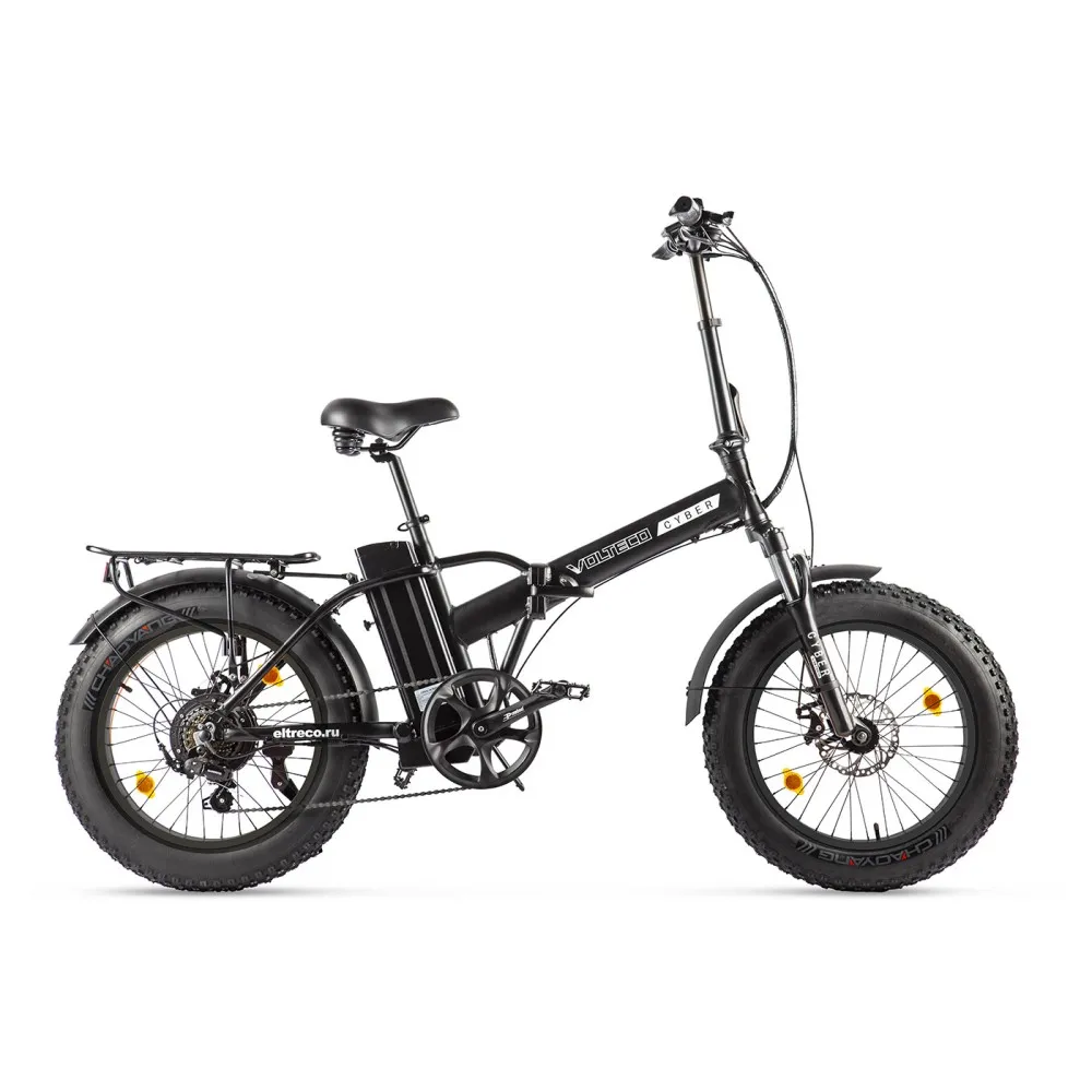 Этот электрофетбайк VOLTECO CYBER с электроприводом, с широкими и мягкими шинами, что позволяет справляться с условиями пересеченной местности, езда наиболее комфортная. Прочная конструкция, красивая, строгая и очень крепкая  алюминиевая рама с широким рулем стойко прослужит лучшим другом в любых суровых ситуациях. Пользуется спросом у любителей экстремальной езды по бездорожью, грязи, снега, песку, рыхлому грунту, по холмам и другим непроходимым местам, чувствуя себя уверенно. Подходит для езды в любое время года. Своими неповторимыми дизайнерскими решениями привлекает большое внимание. Брутальный, строгий, классический черный цвет пользуется хорошим спросом у стильной молодежи, которой не все равно как они выражают себя среди сверстников и друзей. Обладает большими достоинствами: Багажник для перевозки тяжелого груза, усовершенствованная подножка, дисковая система торможения, сокращает тормозной путь, способность складываться. Можно без труда перевозить в легковом автомобиле, удобно хранить в небольших помещениях, хорошо заходит в лифт, парковочные места не проблема даже в центре города.